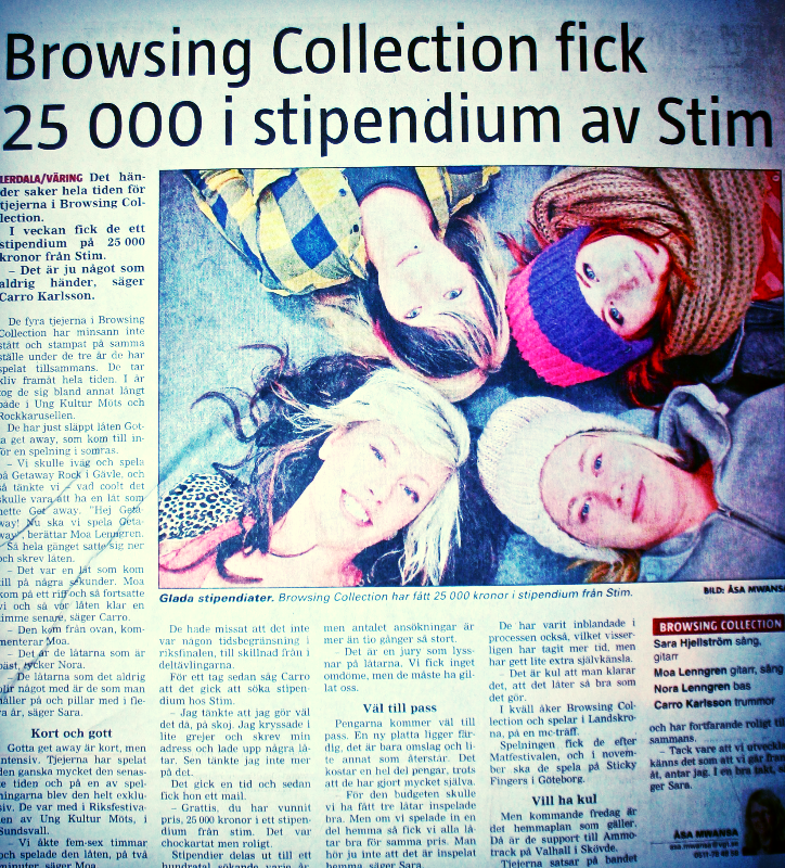 The newspaper of Skövde, SN, published an article on new years eve 2011 that Browsing Collection was the band of the year. "The girls are talented, sober, good-looking and have had an eventful year".
